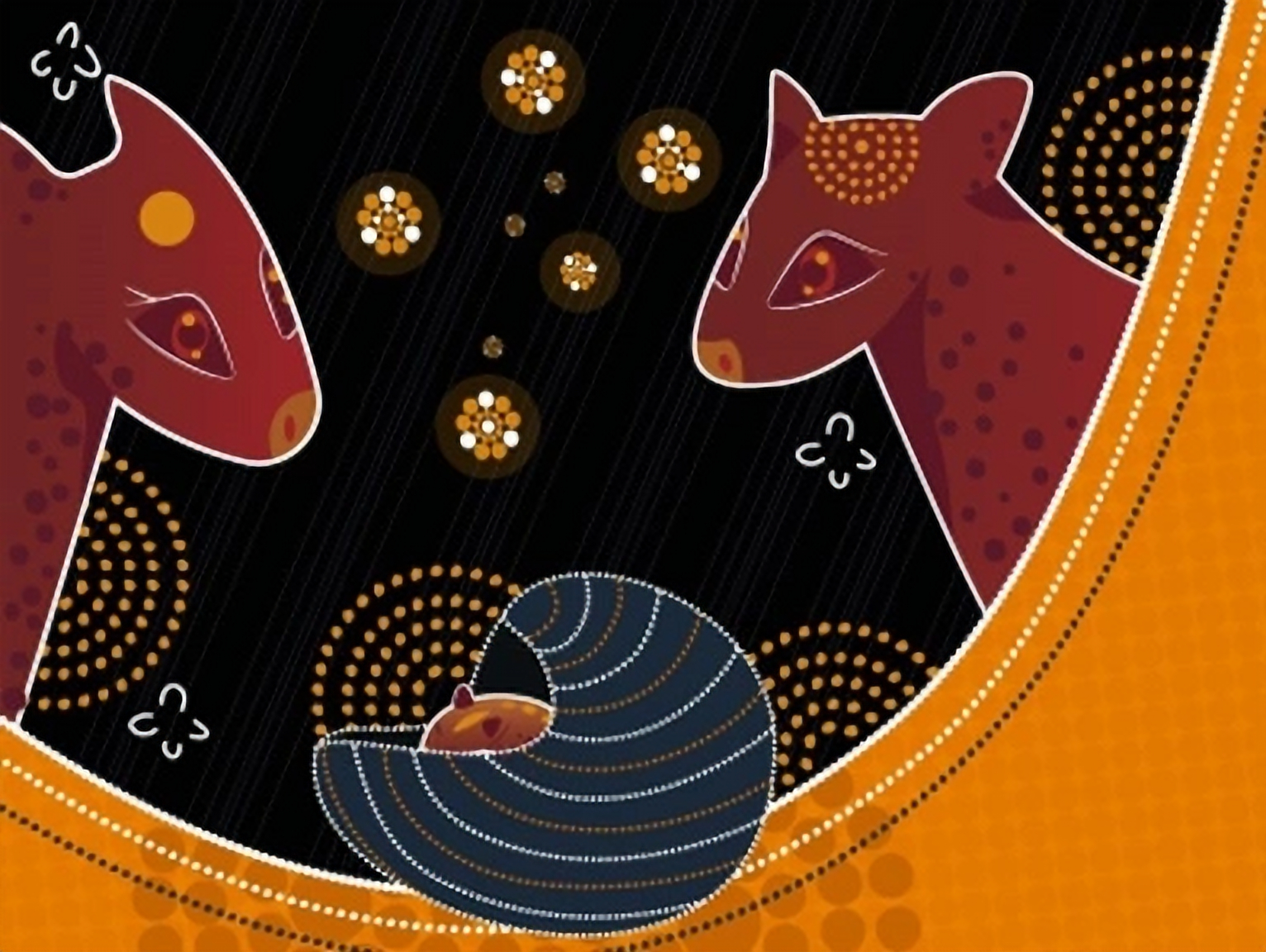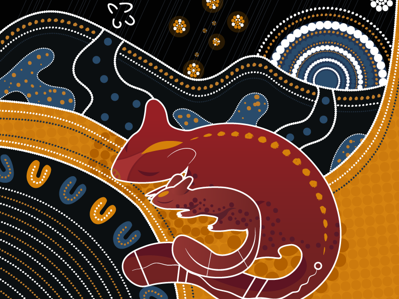 We meet Mama Possum as a baby and hear the story of her mother being taken by a dingo. She is cold and alone longing for her mother’s return. The dingo in the PMS is no villain, Dingo is just being dingo, a sacred animal in many cultures, for example: In the Dingo Dreaming of Beaudesert country men named Gwyala and Burrajum trained the dingoes Ningroongun and Barrajanda to help them hunt. They hunt a kangaroo rat and their shadow is seen by girls who tell their people who are camping close by. The men of their tribe chase the dogs, wanting the kangaroos they are chasing. The men end up fighting with the dogs which results in the dingoes dying. Their death caused a great flood that flattened the mountains and swallowed all the people of that tribe. Gwyala and Burrajim took the dogs and buried them under twin peaks east of Wollumbin (Mt Warning). Even today these twin peaks are known as Ningroongun and Barrajanda, or the Cougals. Story from artist Cynthia Farr Baruŋgam [1].